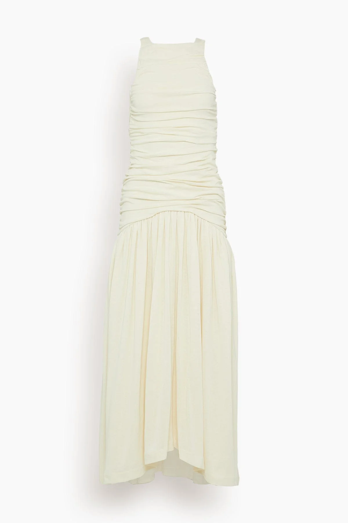 The Bite Studios Evidente Shoulder Dress features their signature silhouette. You'll love the flattering ruching along the bodice of this midi dress with a flowing skirt. Wear yours with heels and a clutch. - Midi length - Fitted bodice with ruching - Flowing skirt - Sleeveless - 100% Organic cotton