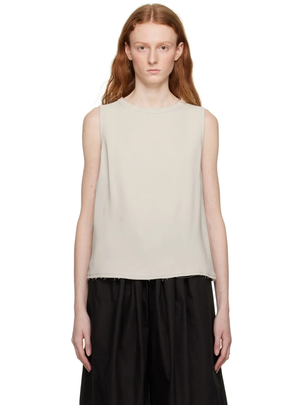 Stretch viscose crepe tank top. · Raw edge at crewneck and hem · Darts at chest Supplier color: Silver cloud 97% viscose, 3% elastane. Made in Portugal 231734F111000