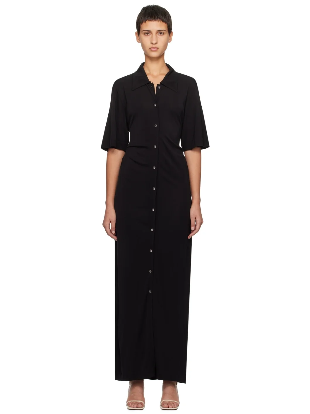 Viscose jersey dress. · Spread collar · Button closure · Drawstring at low back · Unlined Supplier color: Black 100% viscose. Made in Portugal 241734F055004