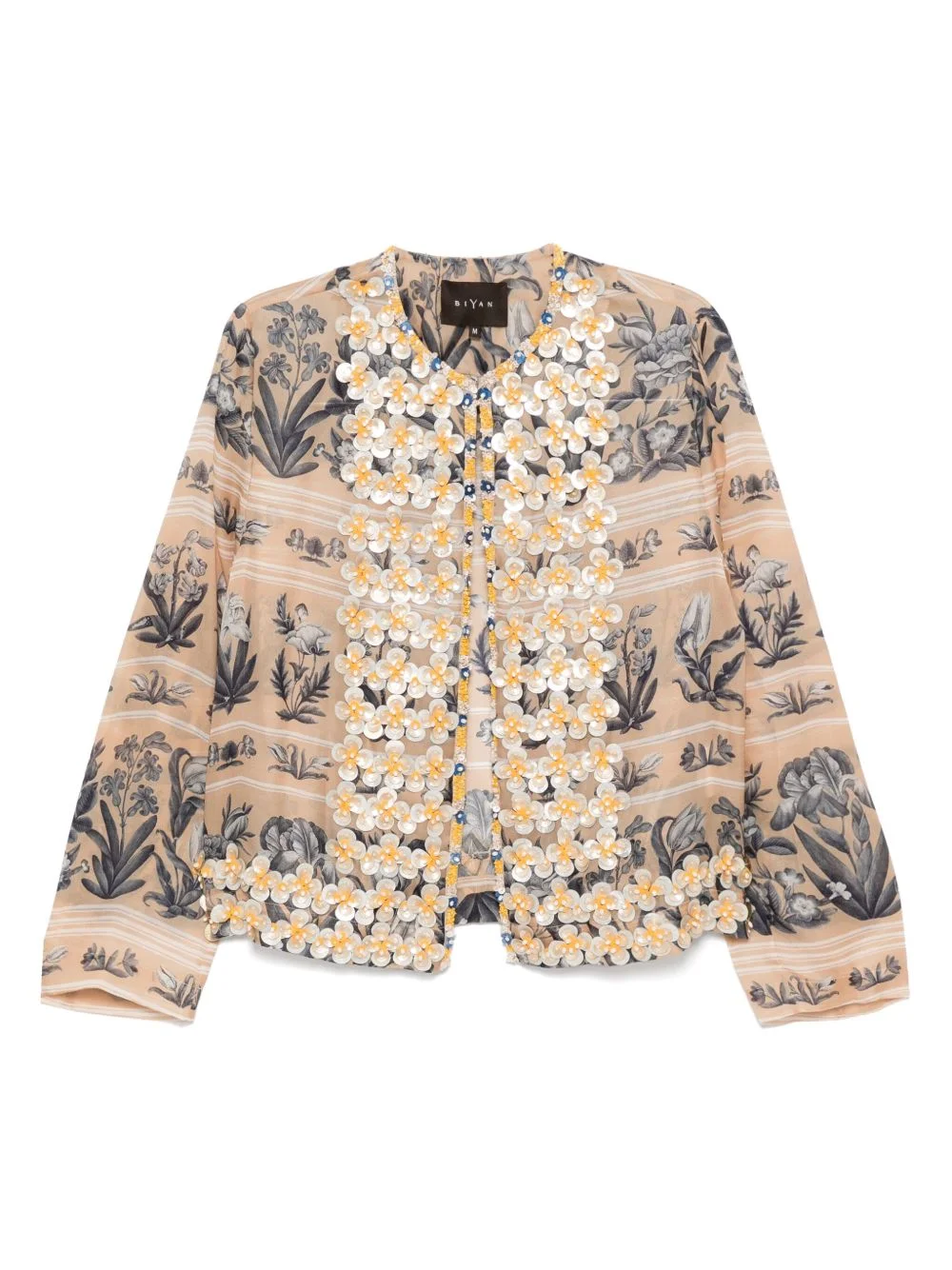 embellished printed cropped jacket Highlights - Light brown - Open front - Long sleeves Imported Composition Linen/Flax 50%, Silk 50% Washing instructions Dry Clean Only