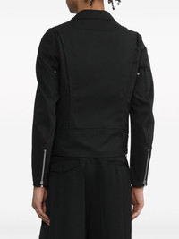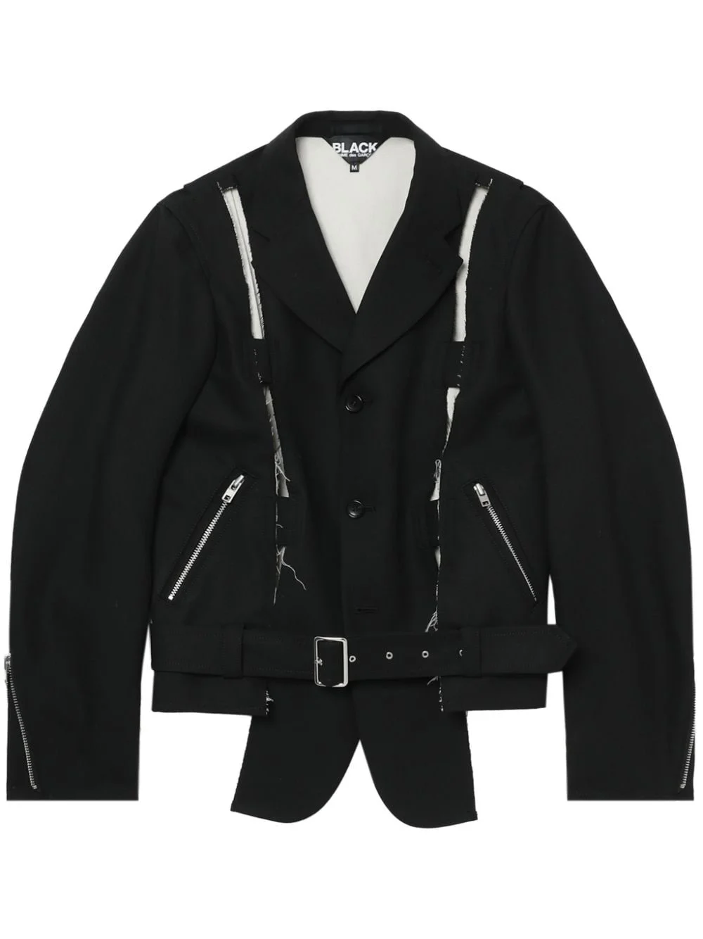 cut-out detailed biker jacket Highlights - Black - Wool blend - Notched lapels - Cut-out detailing - Front zip fastening pockets - Belted waist - Long sleeves - Asymmetric hem - When buying this unisex item, keep in mind that it is graded in standard men's sizing. Imported Composition Polyester 65%, Wool 35%