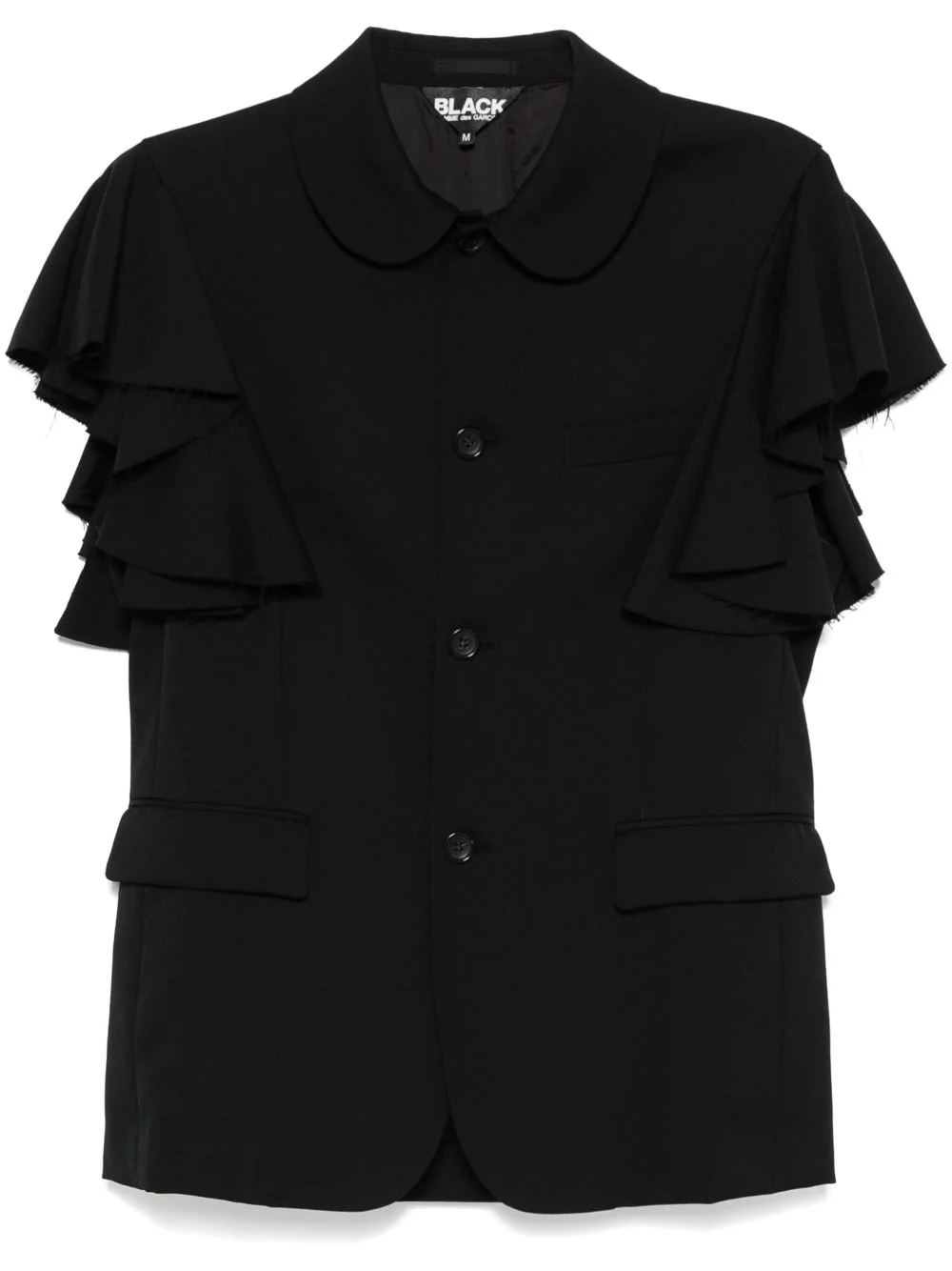 ruffle-detailing blazer Highlights - Black - Wool - Twill weave - Ruffled detailing - Front button fastening - Rounded collar - Chest welt pocket - Short sleeves - Two side flap pockets - American rear vent - Full lining - Straight hem - When buying this unisex item, keep in mind that it is graded in standard men's sizing. Imported Composition Lining: Cupro 100% Outer: Wool 100% SIZE & FIT Model measurements Height 5 ft 9 in(1.75 m) Bust/Chest 31.88 in(81 cm) Hips 34.64 in(88 cm) Waist 24.01 in(61 cm) FittingInformation This piece is unisex – expect a slim fit if you usually select men's sizing; expect a looser fit if you usually select women's sizes Made from a midweight non-stretch fabric Washing instructions Dry Clean Only