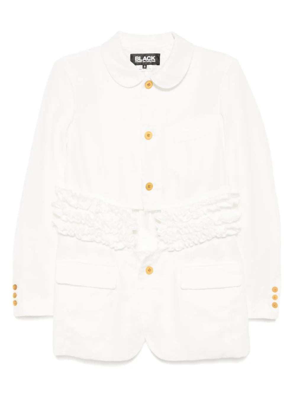 ruffle-trim jacket Highlights - White - Front button fastening - Chest welt pocket - Two front flap pockets - Italian rear vents Imported Composition Lining: Polyester 100% Outer: Polyester 100%