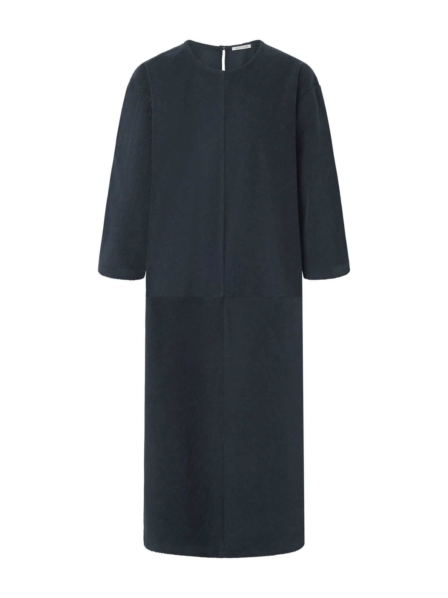 Corduroy Radiant Dress in Grey Navy from Black Crane Highlights - navy - corduroy material - baggy fit - above ankle length dress - dropped sleeves - long sleeves - round neck - button neck closure model wears a size S Made in USA Designer ID: CR-RBD17 Colour ID: DK.GREY Materials 100% COTTON CORDUROY Cold machine or hand wash, tumble dry low or dry flat, no bleach