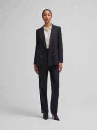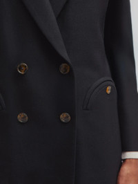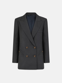Double-breasted oversize lightweight wool black blazer In Blaze's boxy Evernight fit, the 'Alcanara Black' blazer crafted from light virgin-wool twill transitions seamlessly from office to evening, year-round. Featuring sharp shoulders, a relaxed oversized fit, and glossy brown buttons for a subtle finishing touch. - Double-breasted - Cut for an oversized fit, with lightly padded shoulders - Navy coloured lining - Glossy loden inspired buttons - Peak lapels - Smiley outer pockets and four internal pockets - Two back vents 100% Virgin wool Linings: 100% Viscose Made in Italy