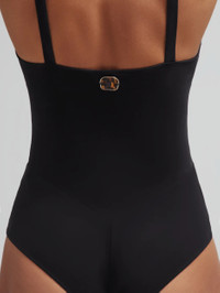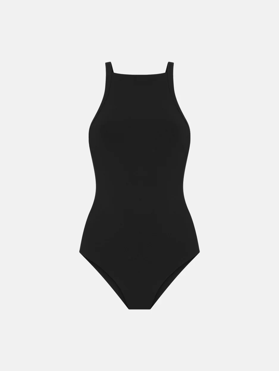 Halterneck black swimsuit Sleek and timeless, the Millefleur Swimsuit in black is cut from silky stretch lycra that gently shapes the figure. Its halter neckline adds structure and elegance, while the design offers flawless comfort. Ideal as swimwear or worn as a body under tailoring, it features the signature seahorse logo in tortoiseshell acetate on the back. 76% Polyamide 24% Elastane Made in Italy