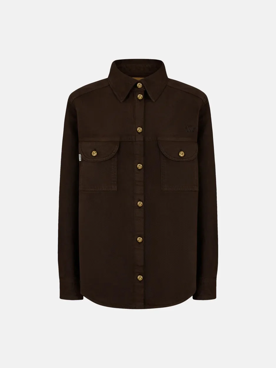 Women’s brown denim shirt This Berber shirt in chocolate-brown cotton fabric has two handy appliqued Smiley breast pockets, a classic collar and gilded loden-effect buttons. Regular fit. - Designed for a relaxed fit - Mini loden-inspired metal buttons - Straight point collar - Smiley chest pockets 100% Cotton Made in Italy