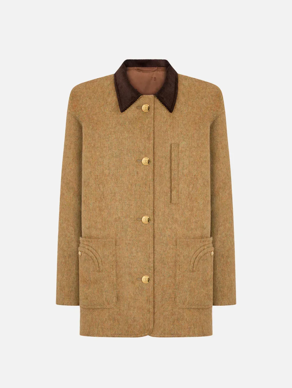 Women’s ochre melange wool jacket with double pockets Debuting in the Fall Winter 2025 collection, the Denali Clelia Jacket stands out for its warm, luminous hue in perfect harmony with the autumn season. Its understated yet refined design is made unique by pockets in varying shapes and sizes, a contrasting corduroy collar, and embossed gold logo buttons — details that embody the DNA of BLAZE Milano. An everyday essential with a refined twist, perfect even for a weekend escape. - Slim fit - Corduroy collar - Back waistband with topstitching - Gold-tone buttons with embossed logo - Two horizontal slit pockets, two Smiley pockets, and a vertical chest slit pocket - Chocolate lining with logo motif 100% Virgin wool Lining: Viscose Made in Italy