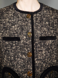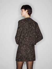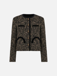 Velvet-trimmed boucle-tweed bolero jacket BLAZE Milano’s collarless, cropped bolero jacket, now in black and beige boucle wool, with black velvet-edged neckline, hems and pockets. To pair with the matching miniskirt. - Fits true to size with lightly padded shoulders - Cropped design, cuts above the hips - Crest-embossed metal buttons - Smiley outer pockets and one internal pocket 44% Wool 38% Alpaca 18% Polyamide Lining: Viscose Made in Italy
