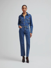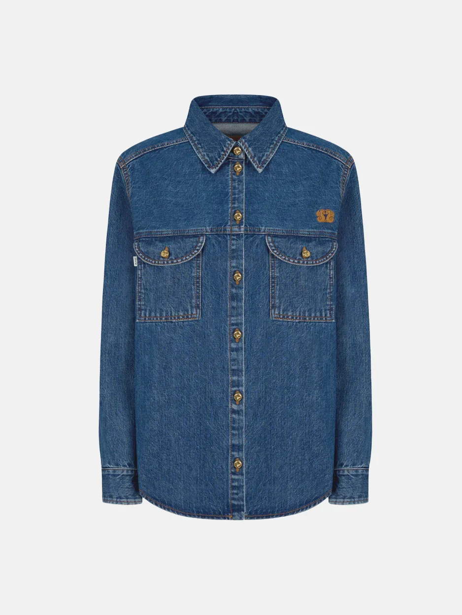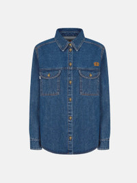 Women’s blue denim shirt A washed-effect denim shirt-jacket with appliqued Smiley pockets on the front. Gilded loden-effect buttons and contrasting rust-colored stitching. - Mini loden-inspired metal buttons - Straight-point collar - Smiley chest pockets 100% Cotton Made in Italy