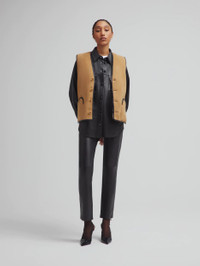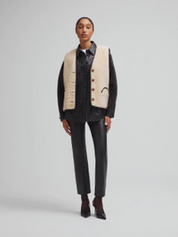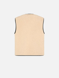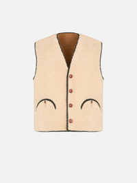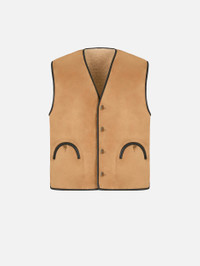 Reversible leather-trimmed camel shearling vest This straight-cut gilet in camel shearling with leather trim and tortoiseshell-effect buttons pairs wonderfully with the dark brown polo shirt. - Slightly relaxed fit - Camel shearling - Tortoiseshell-effect buttons - External Smiley pockets 100% Lambskin Shealing Made in Italy