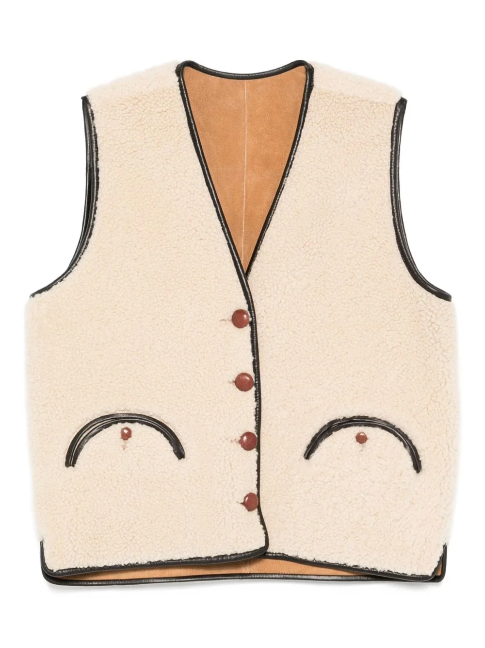 button-fastening shearling gilet Highlights - Camel - Shearling - Button fastening - Black leather trim - Welt pockets - Curved welt pockets Made in Italy Composition Sheep Skin/Shearling 100% SIZE & FIT Model measurements Height 5 ft 10 in(1.78 m) Bust/Chest 31.49 in(80 cm) Hips 37 in(94 cm) Waist 23.62 in(60 cm) Washing instructions Specialist Cleaning