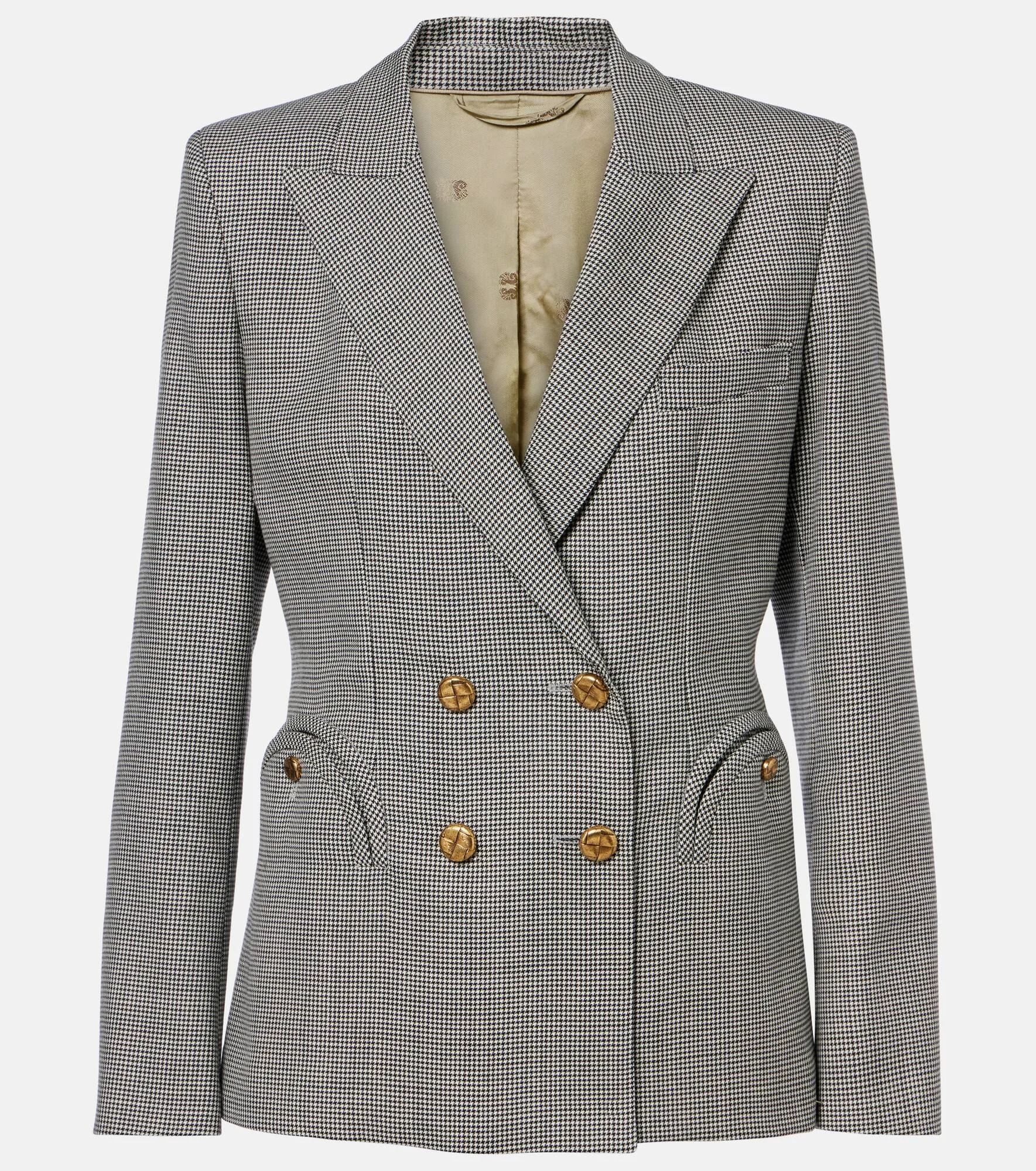Foregrounding premium quality and timeless design, Blaze Milano pays tribute to a perennial fashion favorite: the blazer. The Charmer blazer is made from pure virgin wool in an elegant style with a houndstooth pattern and structured shoulders. Product Details - Material: 100% virgin wool - Care instructions: dry clean - Made in Italy - Color: black - Designer color name: Black White - Lining: 100% viscose - Sleeve lining: 60% acetate, 40% viscose - Hardware color: bronze - Peak lapel - Shoulder pads - Closure: double-breasted (four buttons) - Pockets: breast pocket, buttoned pockets, internal pockets - Cuff: four buttons - Includes: garment bag - Item number: P01137825 Size & Fit - True to size - Shoulder pad inserts - Cinched waist - Non-stretchy fabric - Falls below the hip - The model seen in the picture is 178cm-5'10" and wearing a size 1