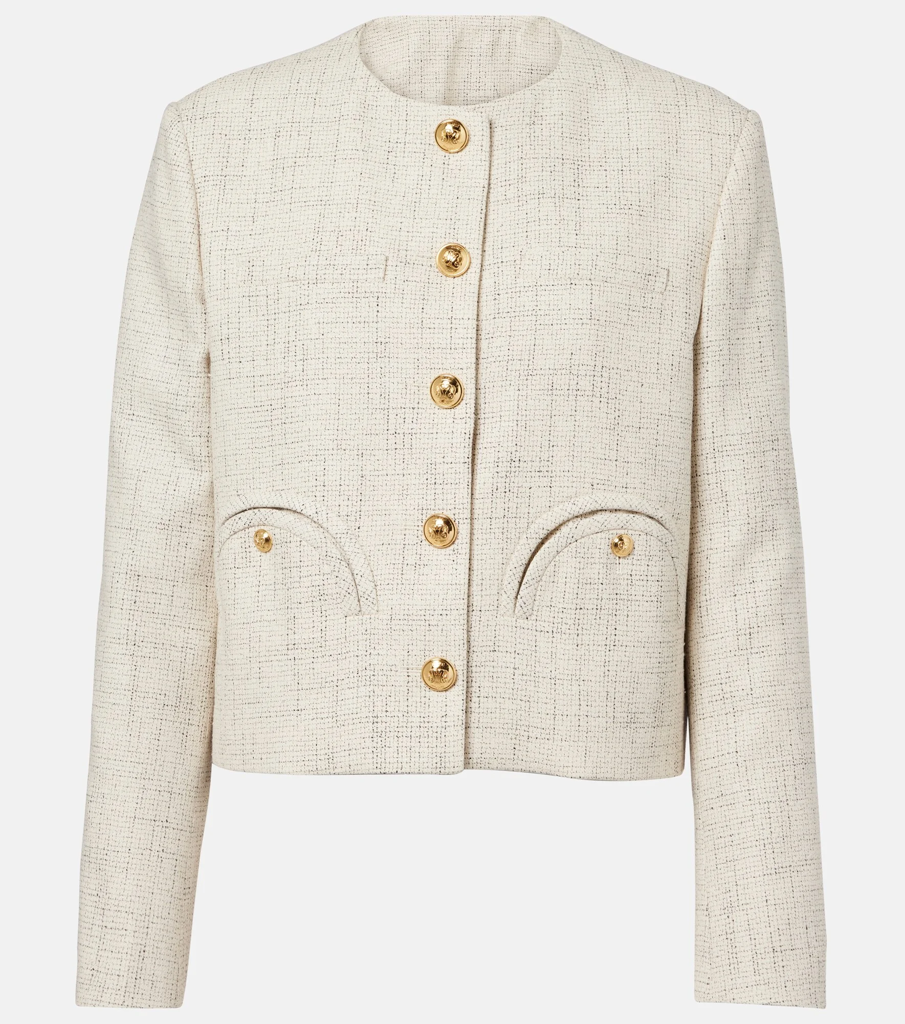Blaze Milano fuses traditionally feminine and masculine codes to create inspiring styles with an enduring appeal. Crafted from tweed, the Crancy Shamo jacket is designed with a structured, slightly cropped silhouette and signature Smiley pockets. Product Details - Material: 48% wool, 27% cotton, 11% polyester, 11% viscose, 3% silk - Care instructions: dry clean - Made in Italy - Color: white - Designer color name: Oyster Wn01 - Lining: 100% viscose - Sleeve lining: 100% viscose - Closure: buttoned front - Pockets: buttoned pockets, welt pockets, internal pockets - Cuff: three buttons - Shoulder pads - Item number: P01157168 Size & Fit - True to size - Dropped shoulders - Straight fit - Non-stretchy fabric - Falls to the hip - The model seen in the picture is 178cm-5'10" and wearing a size 1