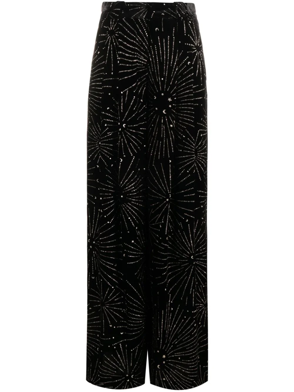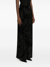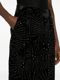 crystal-embellished velvet-finish palazzo trousers Highlights - Black - Velvet finish - Crystal embellishment - Belt loops - Concealed front fastening - Two side slit pockets - Palazzo design Made in Italy Composition Outer: Polyester 55%, Viscose 38%, Silk 7% Lining: Viscose 100% SIZE & FIT Model measurements Height 5 ft 11 in(1.8 m) Bust/Chest 32.67 in(83 cm) Hips 36.22 in(92 cm) Waist 24.4 in(62 cm) Measurement FRONT RISE 12.99 in(33 cm) HIPS 35.43 in(90 cm) WAIST 27.55 in(70 cm) FittingInformation Designed with a wide-leg cut, these trousers allow for a close fit at the waist and offer a loose and roomy fit over the leg Made from a midweight non-stretch fabric This piece fits true to size – take your usual size