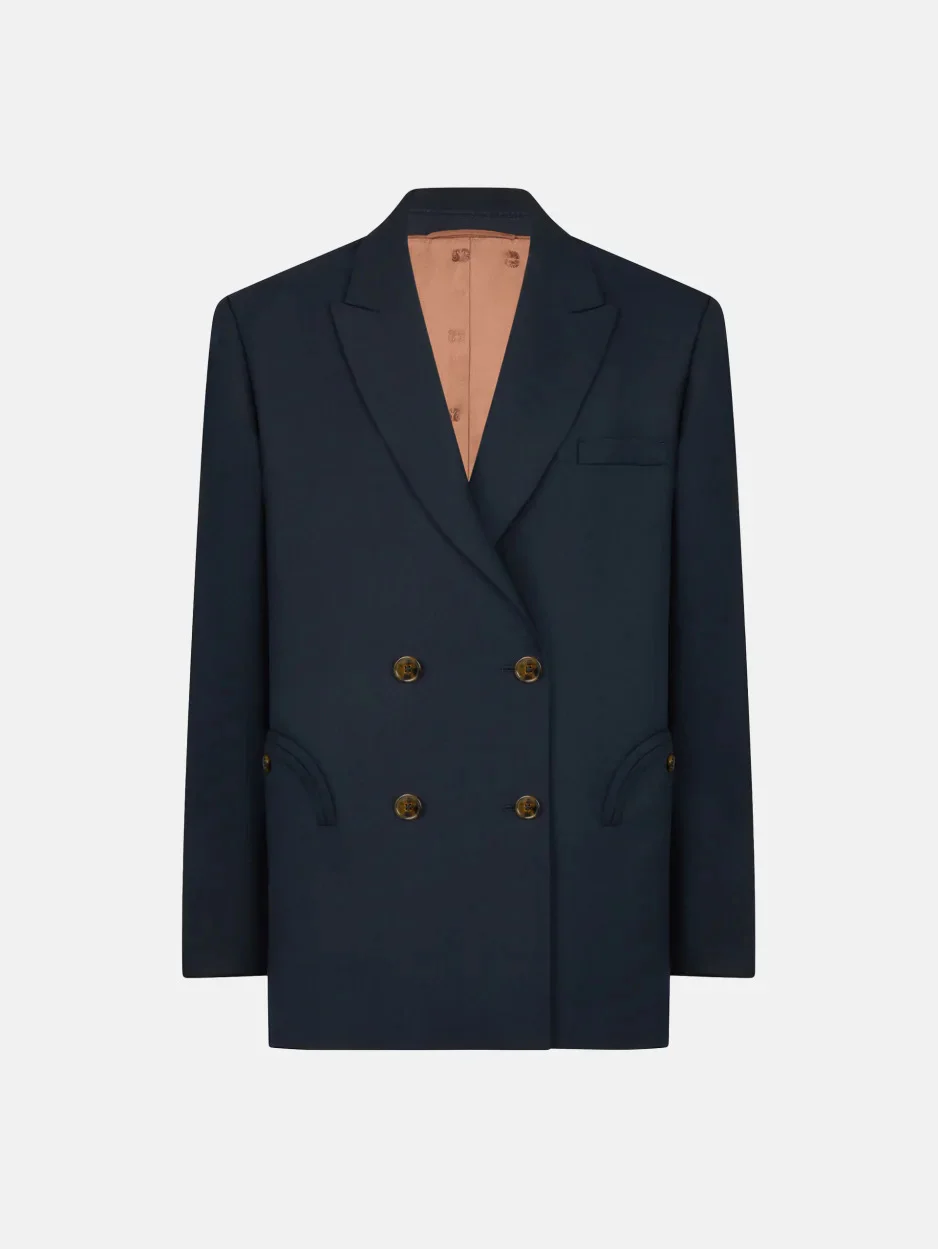 Double-breasted oversize lightweight wool navy blazer The 'Alcanara' Nightbreak Blazer has a roomy and androgynous design with strong padded shoulders, crafted from lightweight virgin-wool twill in a dark navy hue. It features a smooth satin lining with the brand's seahorse print and signature Smiley pockets for instant recall. - Double-breasted - Designed for an oversized fit with lightly padded shoulders - Chocolate coloured lining with crest pattern - Tortoiseshell effect galalith buttons - Peak lapels - Smiley outer pockets and one internal pocket 100% Virgin Wool Linings: 100% Viscose Made in Italy