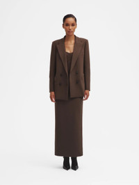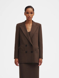 Women’s oversized double-breasted brown wool crepe blazer In an enveloping chocolate shade, the Resolute Everynight Blazer by BLAZE Milano is crafted from wool crepe with a structured texture and a slightly oversized cut. A double-breasted style with a relaxed attitude, it adds character to both daytime and evening looks. Paired with the matching Fox Pants, it creates a chic, contemporary ensemble. - Double-breasted - Slightly oversized fit, boxy design - Lightly padded shoulders - Peak lapels - Side vents - Black loden-effect buttons - External Smiley pockets, one chest slit pocket and one internal pocket - Dark chocolate lining with logo motif 100% Virgin wool Lining: Viscose Made in Italy