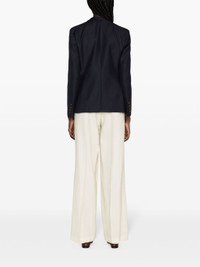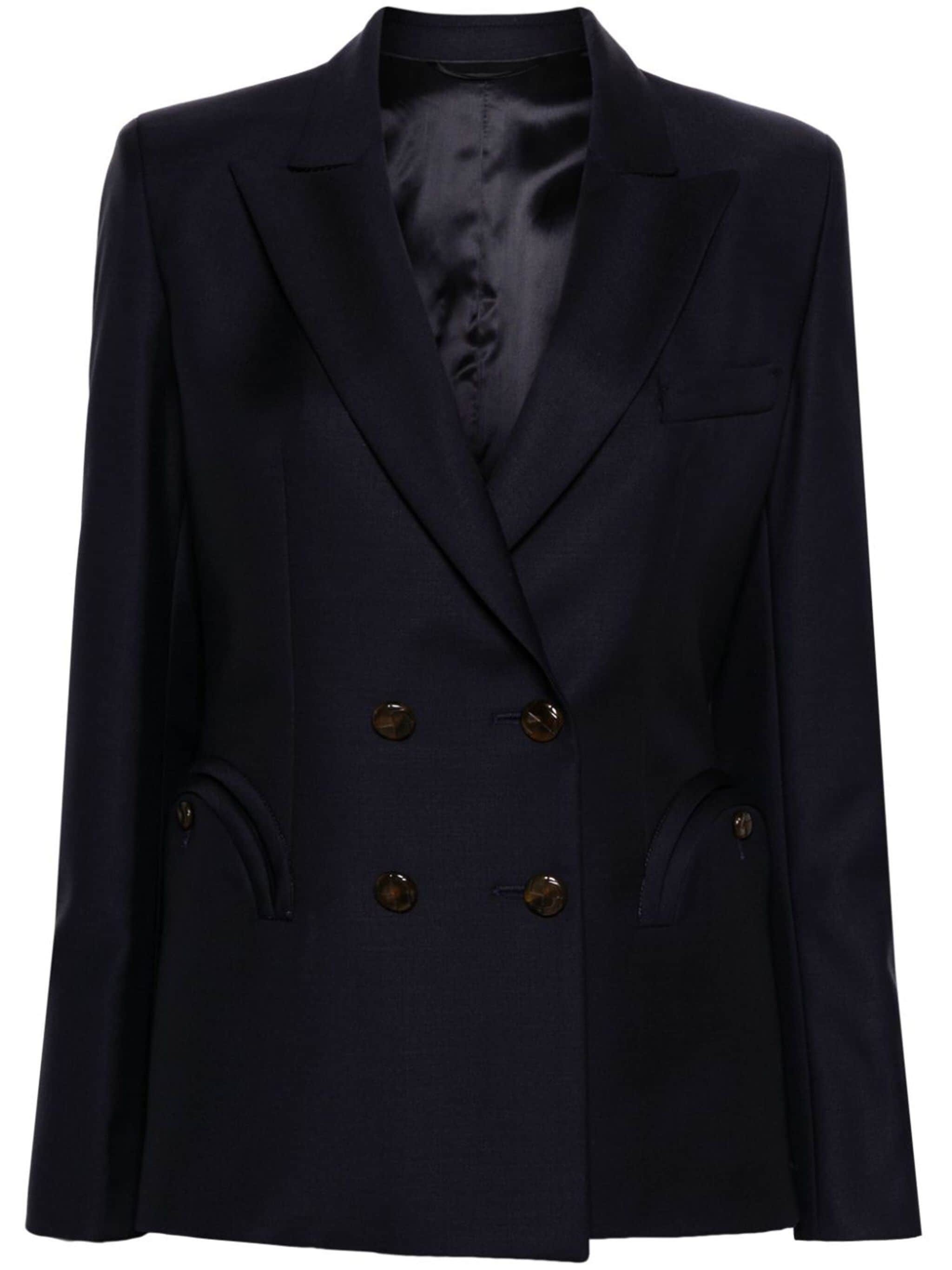 navy blue virgin wool-mohair blend crepe texture dart detailing peak lapels shoulder pads double-breasted button fastening long sleeves buttoned cuffs two curved pouch pockets chest welt pocket internal slip pocket straight hem full lining Size & Fit Model Measurements: Height: 1.8 m Bust/Chest: 87.0 cm Hips: 91.0 cm Waist: 63.0 cm Model wears size I Fabric and Care Designer Style ID: CHD03ESSE067 Designer Colour: 0002 NAVY Composition: Outer: Mohair 29%, Virgin wool 71%; Lining: Viscose 100% Washing instructions: Dry Clean Only Made in Italy