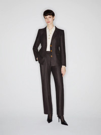 Pleated straight-leg wool and cashmere brown pinstripe pants These dark grey pinstripe trousers offer a loose, flowing fit with a slightly roomier leg; front pleats and a high waist flatter and lengthen the figure. With the matching blazer they make a refined, glamorous set. - High waist - Wide tailored cut - Front pleats - Belt loops - Concealed zip and hook fastening - Back Smiley pocket 92% Virgin Wool 8% Cashmere Lining: Viscose Made in Italy