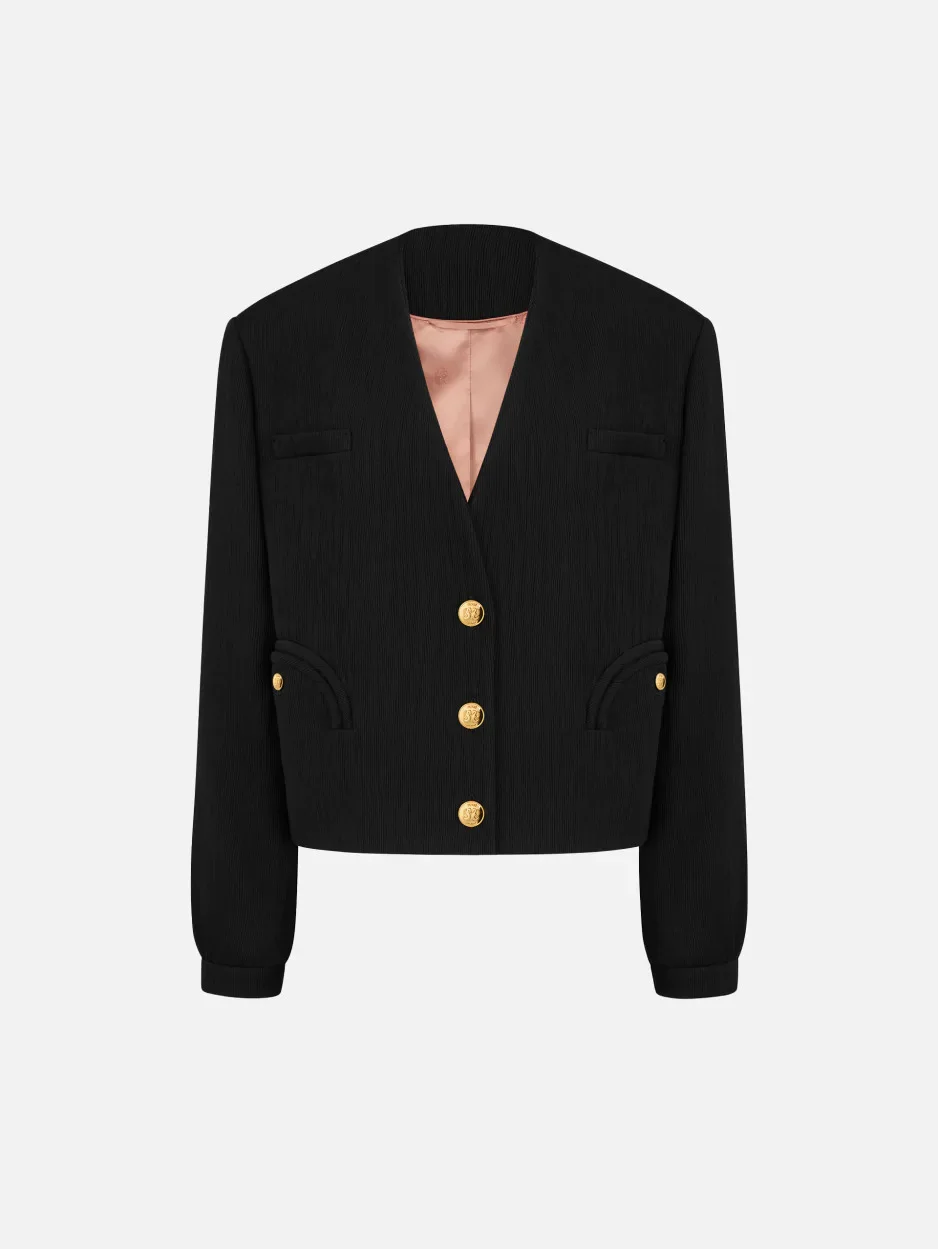 Women’s black micro-pleated viscose bolero jacket The Infinity Riviera Bolero, crafted from black micro-pleated viscose with a V-neckline, gold buttons and a contrasting rose lining, captures BLAZE Milano’s signature understated elegance—especially when paired with the coordinating Sorraia Pants. - Oversized fit - V-neck - External Smiley pockets, two chest slit pockets, two internal pockets - Gold-tone buttons with embossed logo - Rose lining with logo motif 90% Viscose, 10% Polyamide Lining: Viscose Made in Italy