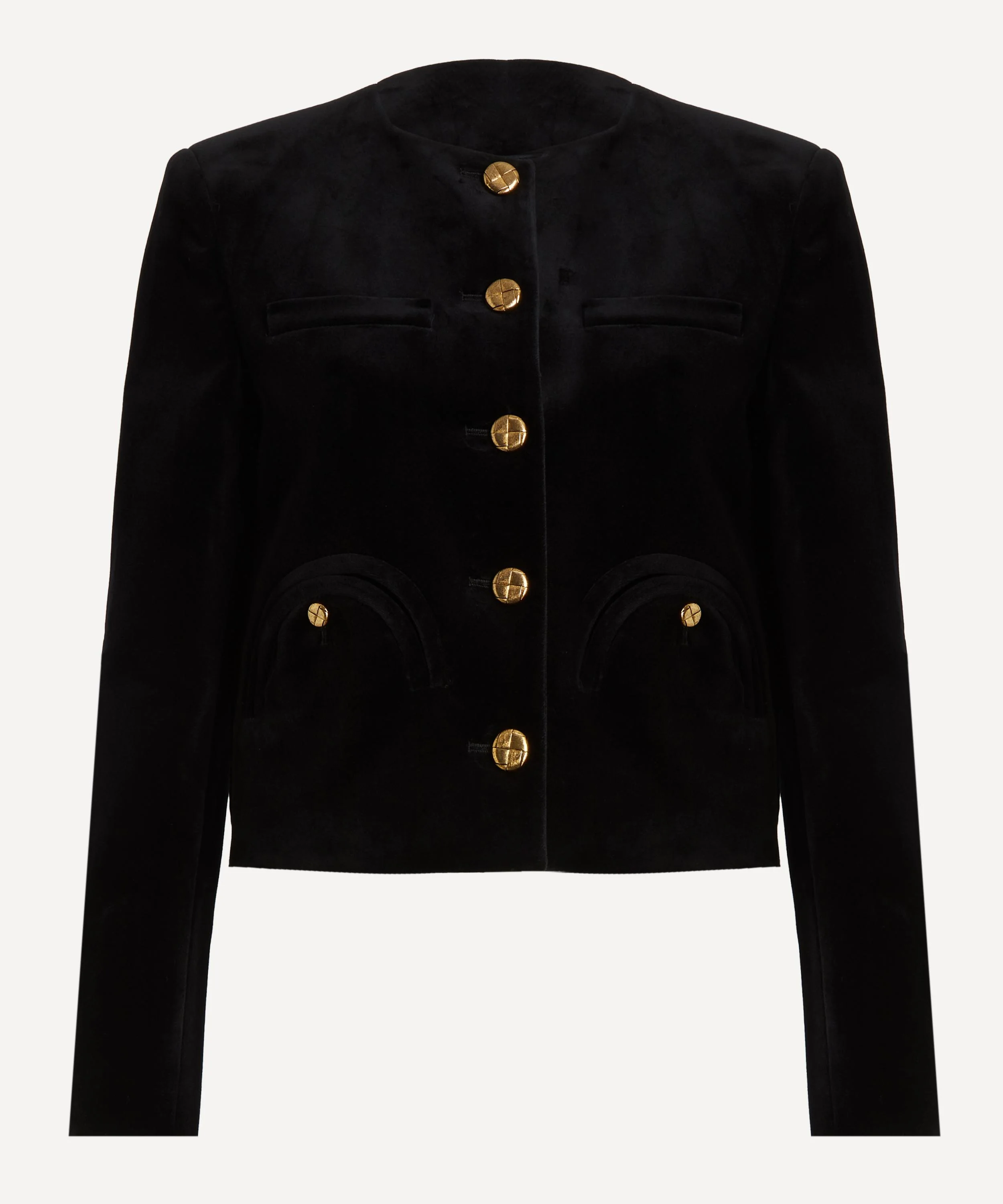 DETAILS Cotton velvet bolero jacket Slim fit Cropped length Structured shoulders Round neckline Button closure Buttoned cuffs Chest welt pockets Buttoned ‘Smiley’ pockets Decorative gold buttons Lined Made in Italy SIZE & FIT Model is 178.5cm/5'10" ; Chest: 77.5cm; Waist: 58.5cm; Hips: 86cm and wears a size 1 COMPOSITION & CARE 100% Cotton Lining: 100% Viscose Dry clean