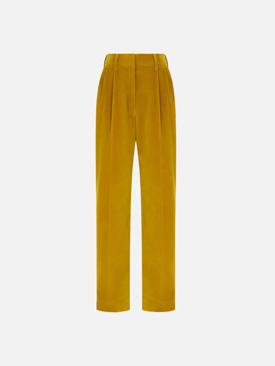 Women’s straight-leg pleated trousers in mustard velvet In warm mustard velvet, the Jealousy Fox Pants embody winter sophistication with a balance of tailoring allure and comfort, making them a polished choice for everyday wear. High-rise with pleats and a front crease, they are designed to be worn with the matching Everyday Blazer for a refined yet surprisingly versatile ensemble. - High-rise - Tailored straight-leg cut - Front pleats - Front crease - Concealed zip and hook fastening - Belt loops - Decorative back Smiley pocket - Chocolate lining with logo motif 100% Cotton Lining: Viscose Made in Italy