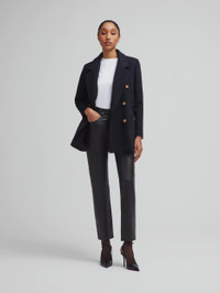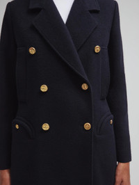 Women’s double-breasted navy wool and cashmere coat The classic double-breasted peacoat-style jacket in navy-blue wool, with loden-style gilded buttons, side pockets and two generous Smiley pockets. - Double-breasted - Boxy cut - Lightly padded shoulders - Navy lining - Loden-effect brass buttons - Classic lapels - External Smiley pockets and side pockets 90% Virgin Wool 10% Cashmere Lining: Viscose Made in Italy
