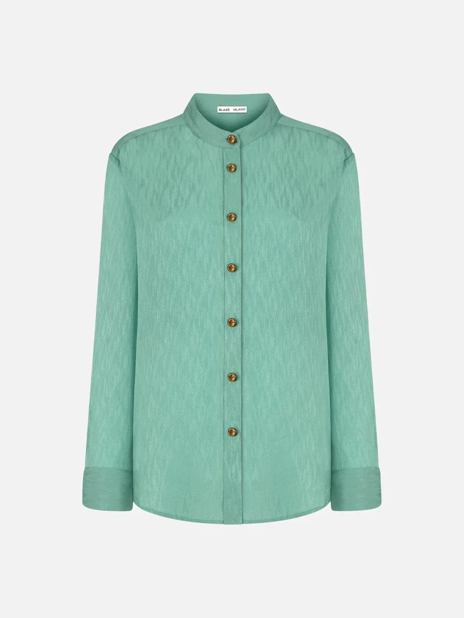 Women’s stand-collar shirt in aqua green silk with textured pattern Light-catching and weightless in feel, the Neptune Koi Shirt is crafted from aqua green silk with a subtle textured pattern. A refined yet contemporary style, it can be worn with white trousers or denim for a relaxed look, or paired with the matching Konik Skirt for an evening by the sea. - Regular fit - Mandarin collar - Tortoiseshell-effect loden-effect buttons 100% Silk Made in Italy