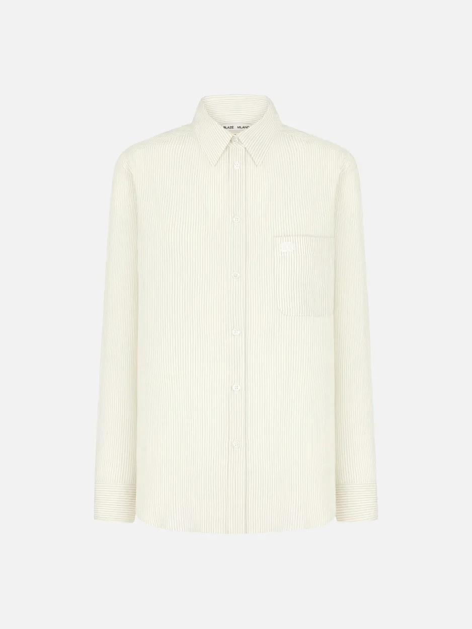 Women’s ivory silk shirt with fine navy stripes A wardrobe cornerstone, the Anabas Shirt is offered in silk with ultra-fine navy stripes that nod to the menswear universe. Refined and timeless, it’s a piece designed to transcend seasons and trends. - Regular fit - Straight-point collar - White four-hole buttons - Chest pocket with embroidered logo 100% Silk Made in Italy