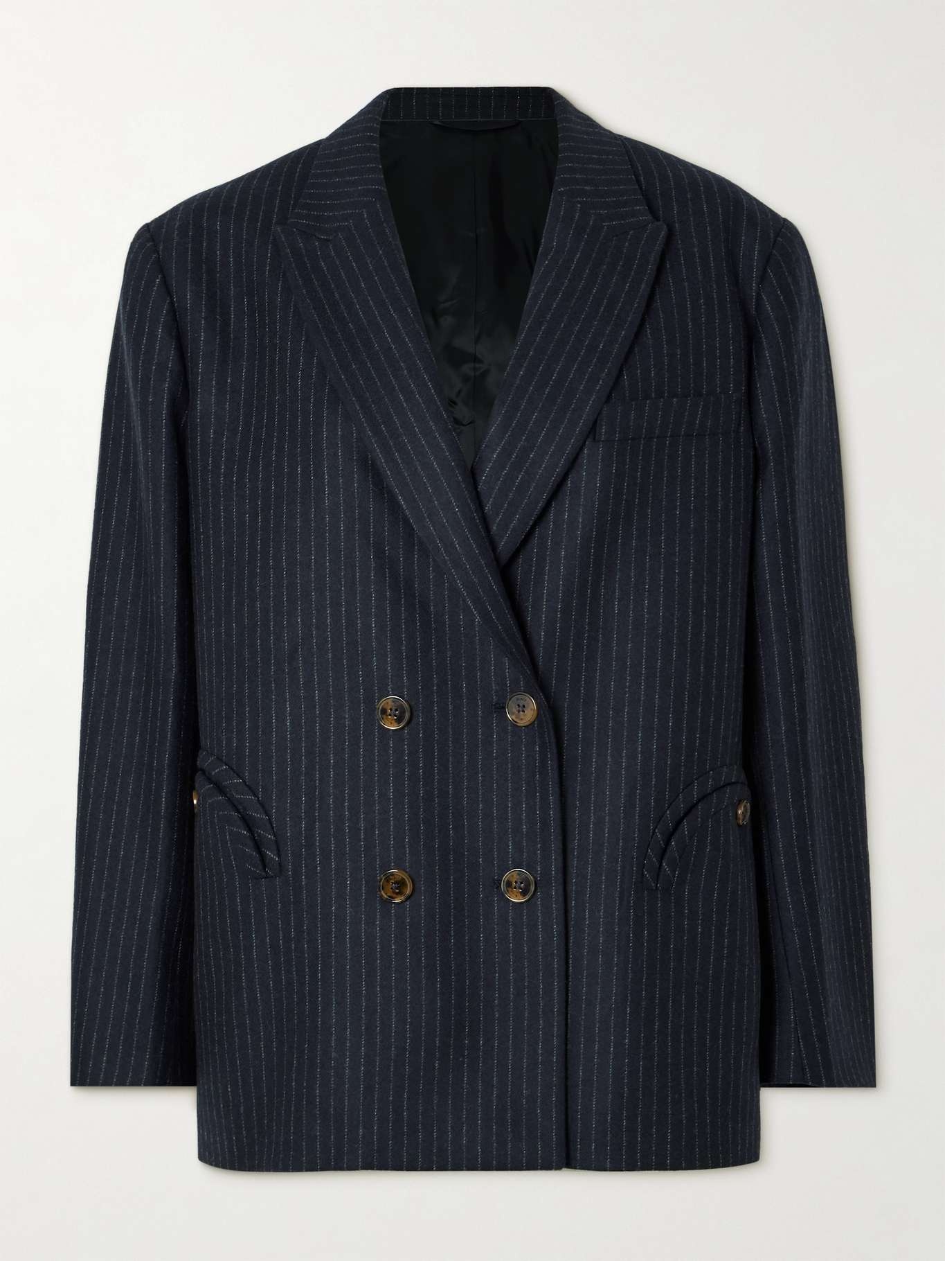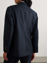 EDITORS'NOTES Blaze Milano's elegant blazers are tailored in Italy by skilled artisans with close attention to fit and fabric. Made from a sumptuous blend of wool and cashmere, this 'Nightbreak' style is patterned with smart pinstripes and has sharp peak lapels. The satin lining ensures it'll slip on smoothly over shirts and dresses. SIZE & FIT Model measurements: - Size 00 = XXS, 0 = XS, 1 = S, 2 = M, 3 = L, 4 = XL - Fits true to size, however those who are between sizes should take the smaller size - Intended for a loose fit - Internal shoulder pads - Mid-weight, non-stretchy fabric - Model is 175cm/ 5'9" and is wearing the designer's size 0 - Bust: 81cm/ 32" - Waist: 64cm/ 25" - Hip: 89cm/ 35" DETAILS & CARE - Navy and white wool and cashmere-blend - Button fastenings through double-breasted front - 92% virgin wool, 8% cashmere; lining1: 100% viscose; lining2: 60% acetate, 40% viscose - Dry clean - Designer color: Lady Maud - Mother-of-pearl: South Korea