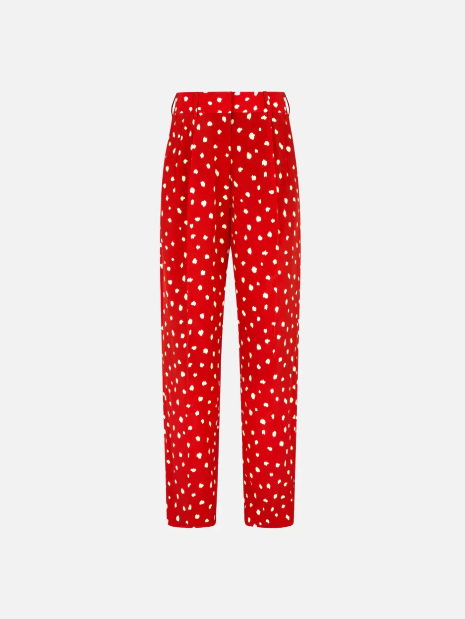 Women’s straight-leg silk trousers with pleats and white polka dots Clean, tailored lines define the Fox Pants, crafted in silk and featuring the collection’s signature polka-dot motif. The high waist and front pleats enhance the construction of this BLAZE Milano signature style. Refined yet versatile, they are the ideal trousers for polished daytime looks, especially when paired with the coordinating jackets from the collection. - High-rise - Straight-leg cut - Front pleats - Front crease - Concealed zip and hook fastening - Belt loops - Decorative back Smiley pocket - Rose lining with logo motif 100% Silk Lining: Viscose Made in Italy