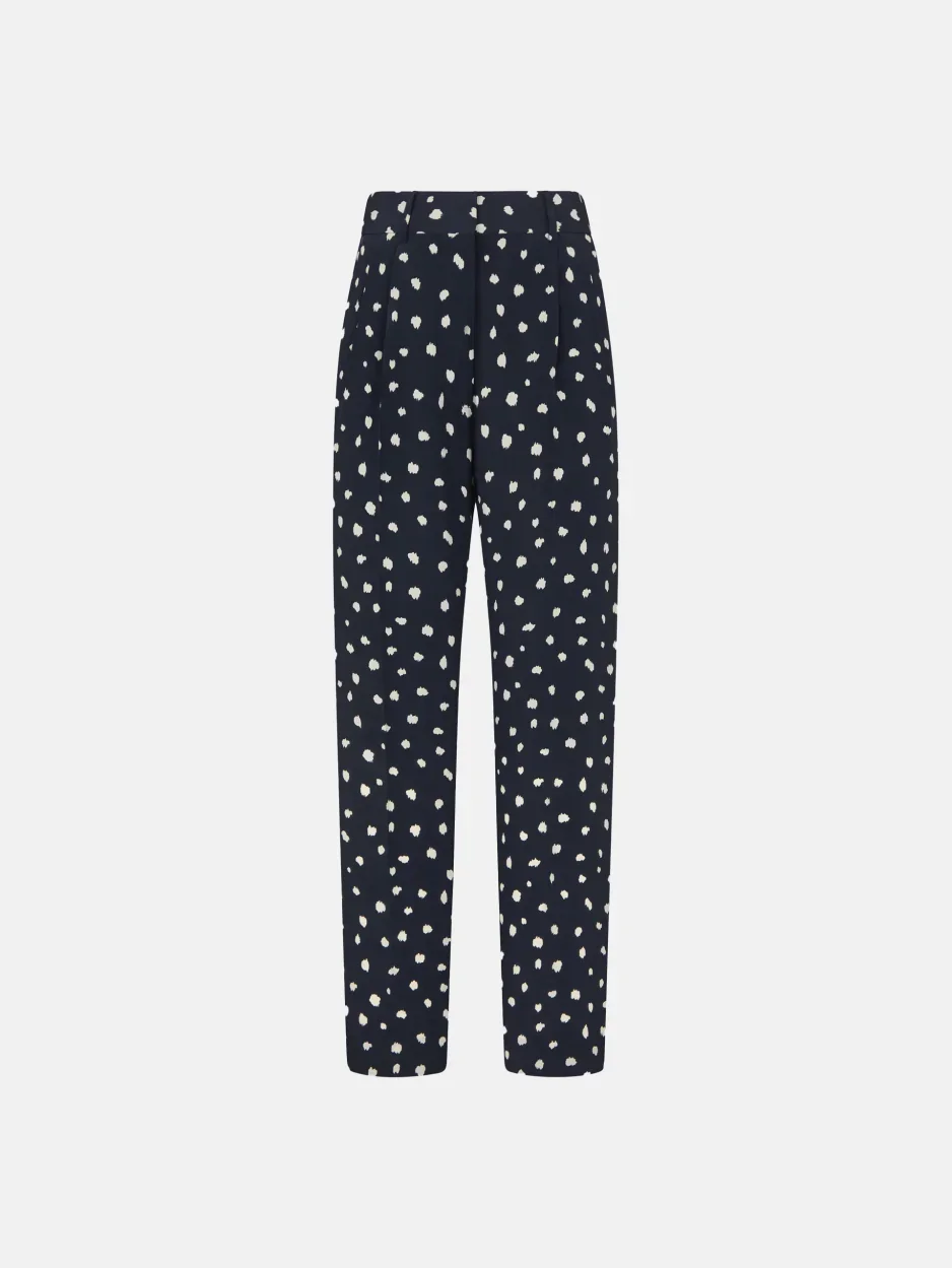 Pleated straight-leg silk navy polka-dot pants Elegant, soft, straight-leg trousers in blue silk scattered with white polka dots. Front pleats, belt loops, high waist and a small Smiley back pocket. To pair with the matching bolero jacket as well as the matching top. - High waist - Tailored straight-leg cut - Front pleats - Belt loops - Concealed zip and hook fastening - Back Smiley pocket 100% Silk Lining: 100% Viscose Made in Italy