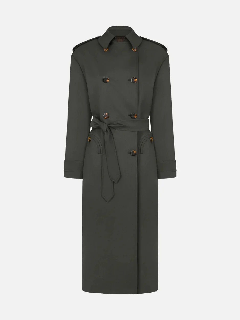 Women’s double-breasted grey-green wool and mohair trench coat Crafted in wool and mohair, the Nahalin Green Aseel Coat reimagines the classic trench as a sophisticated winter essential. Rendered in a refined grey-green hue that evokes understated masculine elegance, it features a slightly oversized fit and a waist belt, layering perfectly over casual looks or elegant dresses. - Double-breasted - Slightly oversized, trench-like fit - Wide collar - Shoulder and cuff tabs - Detachable belt - Tortoiseshell-effect buttons with engraved logo and brass base - External Smiley pockets - Back vent - Dark chocolate lining with logo motif 72% Virgin wool 28% Mohair Lining: Viscose Made in Italy