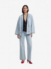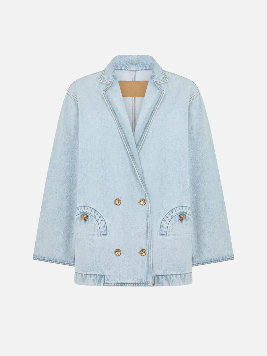 Women’s double-breasted blazer in ice-blue denim For Resort 2026, the classic denim jacket is reinterpreted as a blazer—one of BLAZE Milano’s signature wardrobe pillars. The Cory Jacket features an oversized double-breasted cut, contrast stitching, the iconic Smiley pockets and the new antiqued-gold logo buttons. Sporty in spirit yet unmistakably elegant. - Double-breasted - Oversized fit - Notched lapels - External Smiley pockets - Antique gold-tone buttons with embossed logo - Center back seam - Visible stitching 100% Cotton Made in Italy