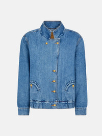Oversize bomber denim jacket with padded shoulders BLAZE Denim unveils the Bomber jacket. Marked by an oversized fit and voluminous sleeve, it is crafted from pure cotton denim in a timeless blue wash. Complete with small golden buttons and signature Smiley pockets. - Designed for a loose fit, with dropped shoulders - Puffed sleeves - Mini loden-inspired metal buttons - Notch lapels - Smiley outer pockets 100% Cotton Made in Italy