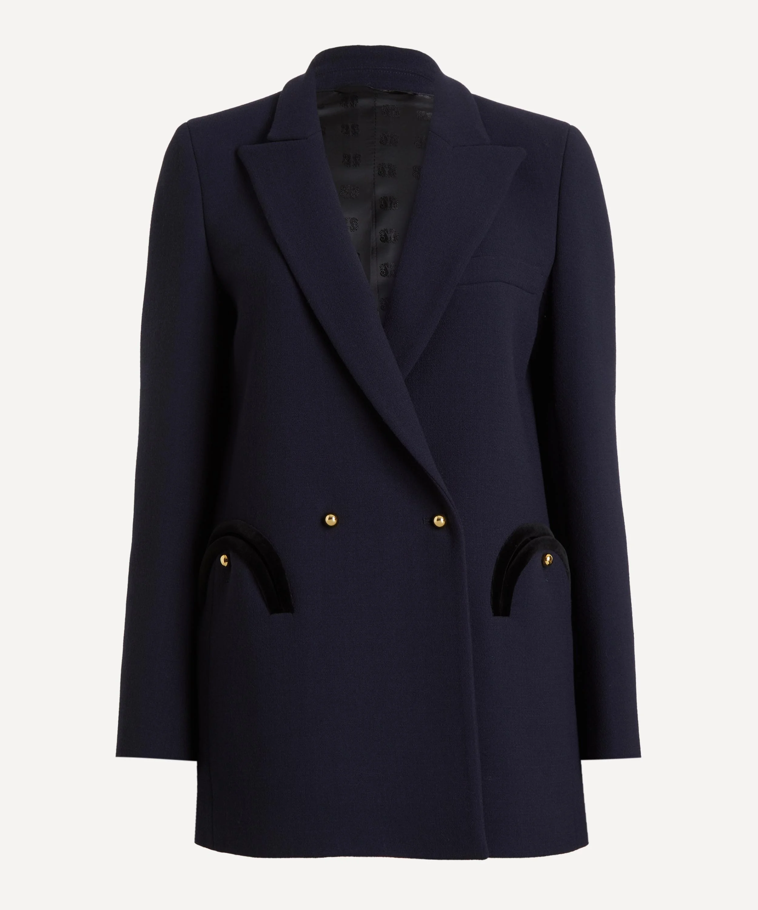 DETAILS Wool blazer Tailored fit Double-breasted Structured shoulders Peak lapels Button closure Buttoned cuffs Buttoned ‘Smiley’ pockets Decorative gold buttons SIZE & FIT Model is 178.5cm/5'10" ; Chest: 77.5cm; Waist: 58.5cm; Hips: 86cm and wears a size 1 COMPOSITION & CARE 100% Wool Dry clean