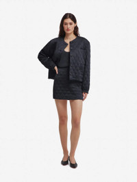 Dark navy quilted satin miniskirt The Coci Miniskirt in dark navy quilted satin blends structure and femininity in a graphic, modern silhouette. Its high waist and slim fit sharpen the lines, while the decorative Smiley Pocket introduces BLAZE Milano’s signature touch. A versatile piece for everyday styling or worn as a set with the matching Gliss Bolero. - Mini length - High-rise - Slim fit - Concealed zip fastening along back - Decorative back Smiley pocket - Blue navy lining with logo motif 52% Viscose 48% Acetate Lining: Viscose Made in Italy