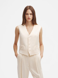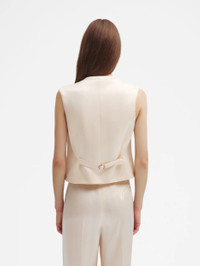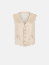 Women’s gilet in ivory satin BLAZE’s Feral Gilet in smooth ivory satin, offers a relaxed fit and includes two signature Smiley pockets as the brand’s distinctive touch to the otherwise minimalist design. Worn as a complete look with the matching pants and blazer. - Sleeveless design - Tailored for a slightly loose fit - Matching satin buttons - Smiley outer pockets 52% Viscose 48% Acetate Lining: 100% Viscose Made in Italy