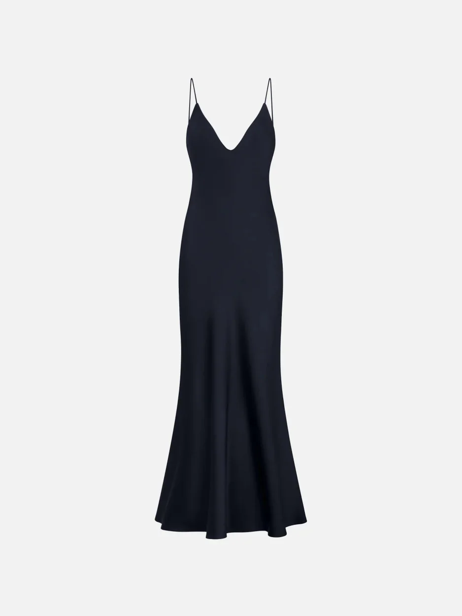 Slip dress in navy satin The ‘Novalis Dark Navy’ Manipur Dress is the epitome of black-time dressing; with its open back, dainty straps and fluid satin drape that falls to the floor. - Slim fit with open back - V-neck - Thin straps - Slips on 52% Viscose 48% Acetate Made in Italy