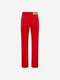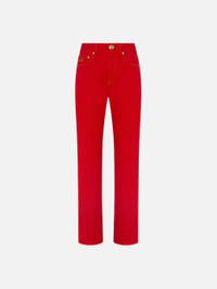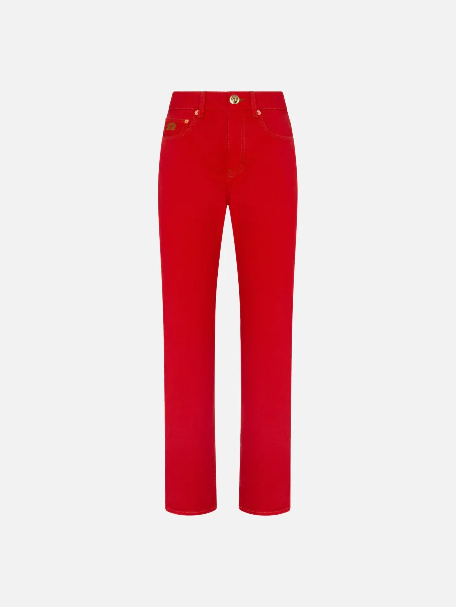 Women’s red slim-fit denim pants Women’s red slim-fit denim pants BLAZE Milano reinterprets the classic five-pocket jean in an intense red hue, transforming it into a statement piece. The mid-rise waist and slim straight leg create a balanced, flattering silhouette. Paired with the coordinating Berber Shirt, it forms a striking head-to-toe denim ensemble. - Mid-rise - Slim fit - Straight leg - Five pockets - Zip closure with antique gold-tone stud button - Waistband with belt loops - Tobacco-coloured embroidered logo on the front pocket - Beige contrast stitching 100% Cotton Made in Italy
