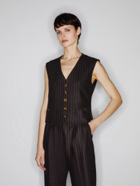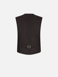 Women’s gilet in brown pinstriped wool and cashmere-blend A relaxed gilet in gunmetal grey pinstripe wool with a row of tortoiseshell-effect buttons and a smart little buckle in the back to adjust the waistline. Perfect to mix with the matching Everynight blazer and trousers as a classic three-piece suit, with a hint of rebel spirit if worn solo over bare skin. - Tailored cut with a slightly loose fit - Glossy brown tortoiseshell-effect buttons - Chocolate brown lining - External Smiley pockets 92% Virgin Wool 8% Cashmere Lining: Viscose Made in Italy