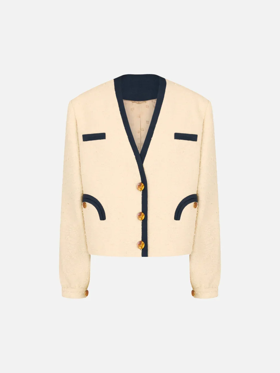 Women’s bolero jacket in textured butter-white fabric with blue trims Women’s bolero jacket in textured butter-white fabric with blue trims Nautical references meet Eighties flair in the Orinda Riviera Bolero, introduced for SS26 in butter white with contrasting navy trims. Crafted from a distinctive cotton-blend fabric with a subtly textured surface, it captures a confident summer attitude. Style it with the Selle Shorts for a chic, unconventional set. - Oversized fit - V-neckline - Contrasting navy trims in viscose canvas - External Smiley pockets, two decorative chest pockets, two internal pockets - Tortoiseshell-effect buttons in brass and amber-toned resin with engraved logo - Camel logo lining Main fabric: 94% Cotton 6% Polyamide Secondary fabric: 68% Viscose 32% Acetate Lining: Viscose Made in Italy