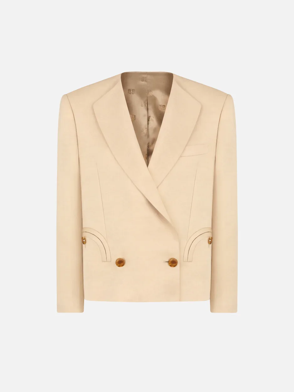 Women’s cropped double-breasted blazer in champagne viscose and hemp The Donzi Roseball Blazer makes its debut in the Resort 26 collection alongside the matching Tuli Shorts, creating a fresh and distinctive ensemble. Defined by its cropped silhouette, double-breasted closure with just two buttons, and collarless peak lapels, it feels modern and refined. The sophisticated blend of viscose and hemp adds lightness and elegance to the design. - Double-breasted - Cropped cut - Lightly padded shoulders - Peak lapels without collar - Tortoiseshell-effect amber-toned buttons with engraved logo - External Smiley pockets, one chest slit pocket and one internal pocket - Back vent - Camel lining with logo motif 68% Viscose 32% Hemp Lining: Viscose Made in Italy