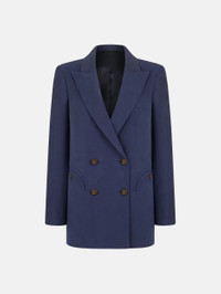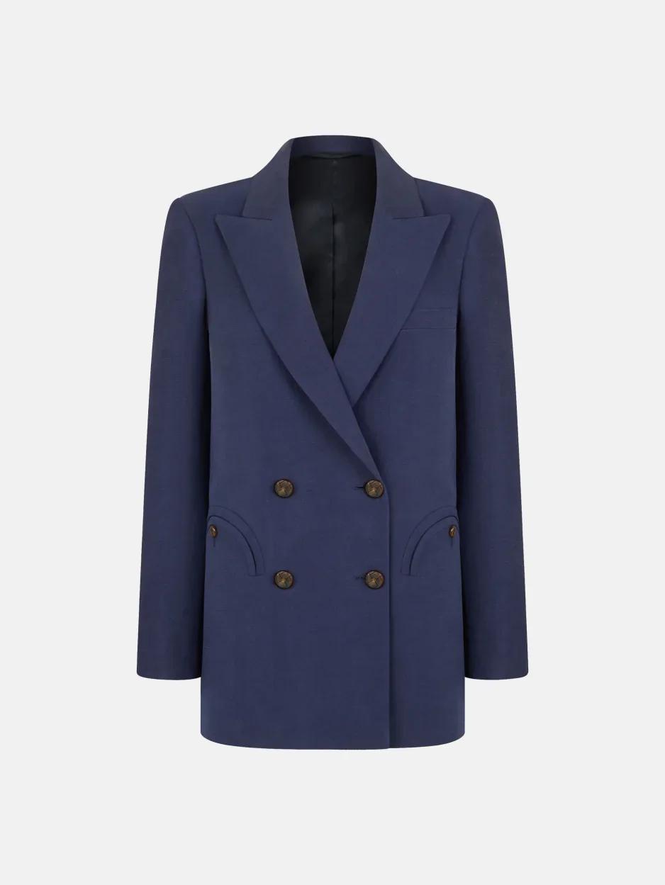 Double-breasted linen and silk navy blazer BLAZE Milano ultra-light silk-linen blend Savannah style is introduced in deep navy, tailored in the brand's classic straight-down Everyday cut. Detailed with glossy, braided design buttons, this Essentials piece can be summer suited with matching pants or a skirt. - Double-breasted - Fits true to size with lightly padded shoulders - Tailored for a straight cut through the waist - Navy coloured liningbr>- Glossy loden inspired buttons - Peak lapels - Single back vent 59% Linen 41% Silk Lining: 100% Viscose Made in Italy