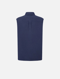 Sleveless shirt in linen and silk navy The sleeveless Savannah Navy Pekin Shirt, crafted from a blend of linen and silk, features glossy woven-effect buttons running up to a classic straight point collar and two signature Smiley chest pockets. It completes a fresh summer ensemble when paired with the matching skirt or pants. - Sleeveless design - Glossy loden inspired buttons - Straight point collar - Smiley chest pockets 59% Linen 41% Silk Lining: 100% Viscose Made in Italy
