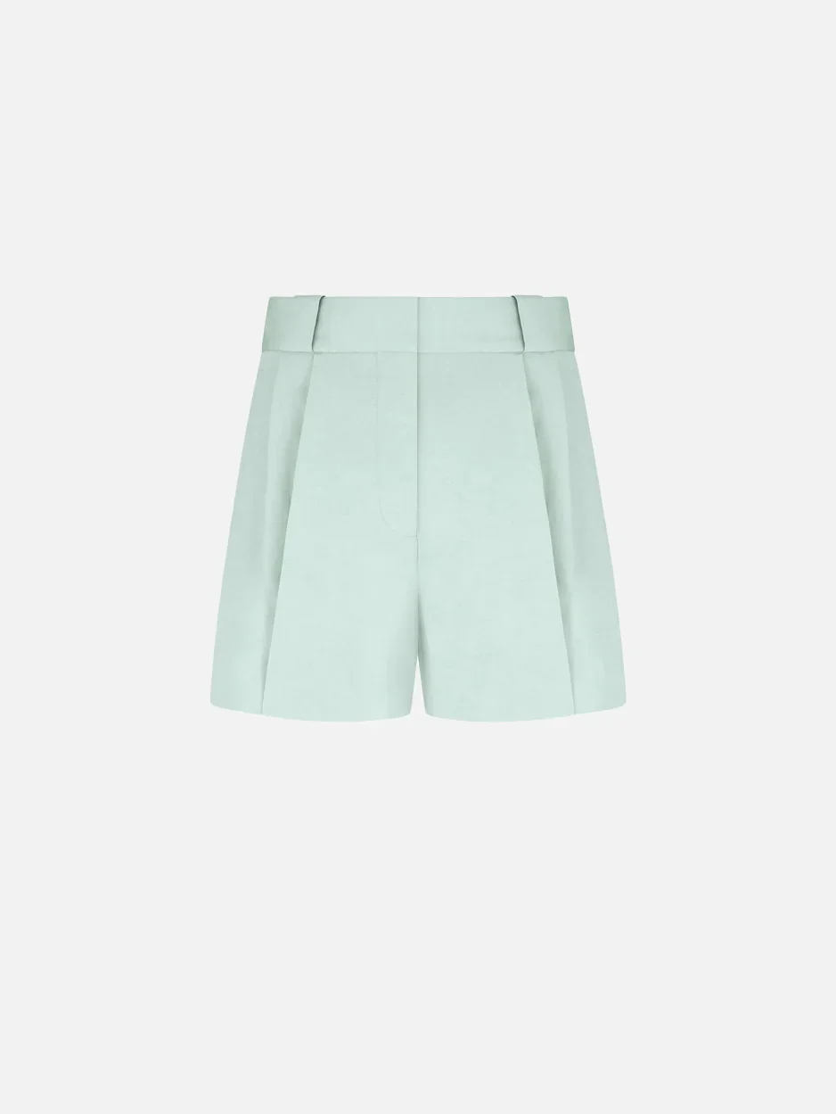 Women’s high-rise shorts with front pleats and crease in ice-blue silk and linen New for Resort 2026, the Selle Shorts are designed to meet the warmer months with relaxed elegance. Cut just above the knee, they reinterpret sartorial tailoring through front pleats and a pressed crease that add volume and movement. Style them with the matching shirt or one of the collection’s blazers for a look with a distinctive character. - High-rise - Wide-leg cut - Above-the-knee length - Front crease - Front concealed zip and hook fastening - Belt loops - Decorative back Smiley pocket - Sage green lining with logo motif 62% Silk 38% Linen Lining: Viscose Made in Italy