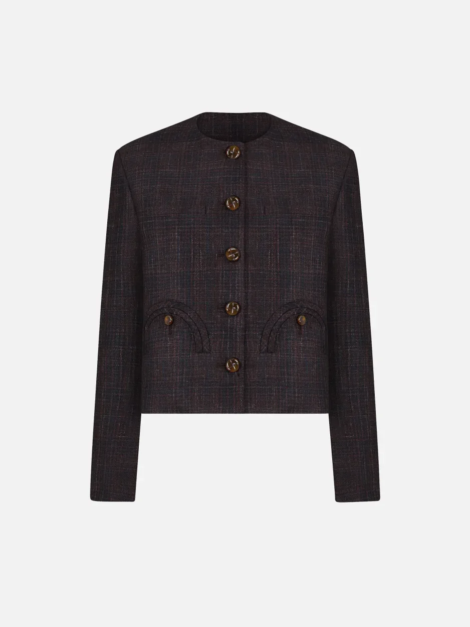 Women’s bolero jacket in wool, silk and linen in chocolate brown with blue check The Askari Shamo Bolero has a refined, bon-ton spirit, heightened in the Askari Chocolate version crafted from a sophisticated blend of wool, silk and linen with a blue check on a deep chocolate base. Paired with the matching Fox Pants, it creates a polished ensemble suited to the office and beyond. - Oversized fit, cropped design - Lightly padded shoulders - External Smiley pockets, two chest slit pockets and one internal pocket - Tortoiseshell-effect loden-effect buttons - Chocolate lining with logo motif 81% Virgin wool 11% Silk 8% Linen Lining: Viscose Made in Italy