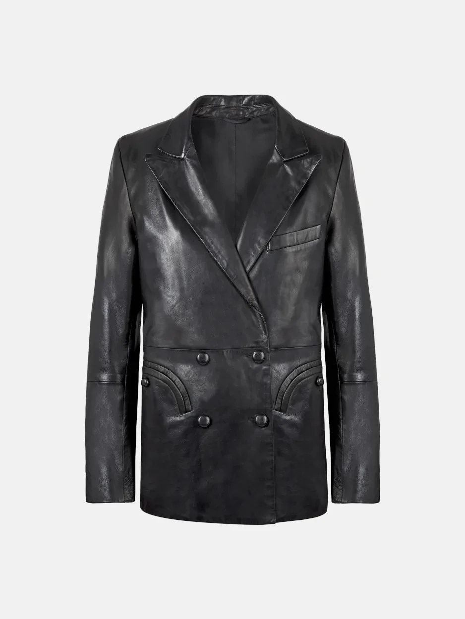 Double-breasted oversize black leather blazer A slightly oversized double-breasted jacket in black lambskin. Padded shoulders lend structure to this leather jacket with one breast pocket and Smiley pockets on both sides. With peak lapels and leather-covered buttons. - Double-breasted - Slightly oversized fit - Padded shoulders - Matching leather buttons - Peak lapels - Two back vents - Smiley pockets and four internal pockets 100% Lamb Leather Lining: 100% Viscose Made in Italy