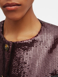Women’s gilet in burgundy sequins A new addition to the Fall Winter 2025 collection, the Villanella Jaka Gilet is entirely embellished with flat sequins in a sophisticated burgundy shade. Its boxy design finds balance when paired with the sleek silhouette of the Sussex Maxi Longuette, creating a sparkling ensemble perfect for parties and gala evenings. - Single-breasted - Slim fit, cropped design - No lapels - Square neckline - Tortoiseshell-effect buttons with engraved logo and brass base - Black lining with logo motif 97% Polyester 3% Spandex Lining: Viscose Made in Italy