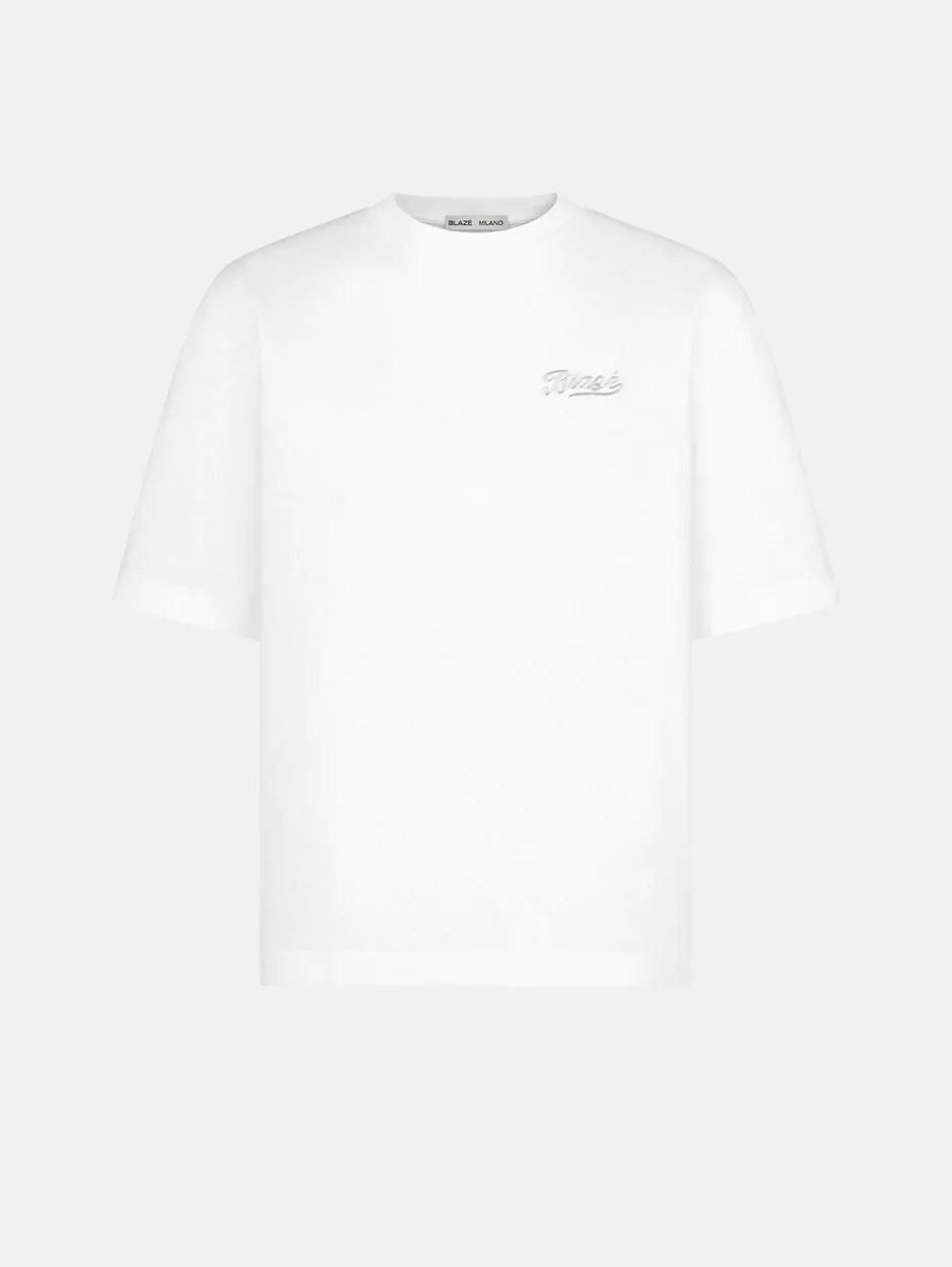 White cotton t-shirt with white embriodered logo White cotton T-shirt with a tone on tone embroidered logo, designed for a regular fit. This minimalist piece brings elegance with the refined logo detail on the chest. Made from premium materials, it reflects Blaze Milano’s commitment to sustainable and high-end fashion. 100% Cotton Made in Italy